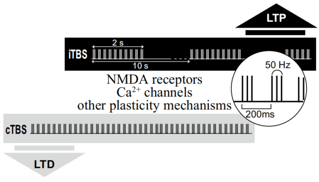 通過多年研究,最終確定TBS模式為:3個50Hz的爆發(fā)刺激為一叢或簇,叢或簇間以5Hz的間隔頻率刺激,總共600脈沖,刺激強(qiáng)度為80%AMT。當(dāng)連續(xù)刺激時,持續(xù)時間為40秒(600個脈沖),稱為連續(xù)爆發(fā)刺激或“cTBS”,該模式刺激會分別在刺激后導(dǎo)致MEP和皮質(zhì)脊髓活動的LTD樣減少并持續(xù)20或60分鐘。相反,間歇性爆發(fā)刺激(iTBS)中連續(xù)刺激2s,間歇8s,總共600脈沖,用時190s。該模式導(dǎo)致MEP大小和興奮性的顯著LTP樣增加,持續(xù)20分鐘。[2][3]