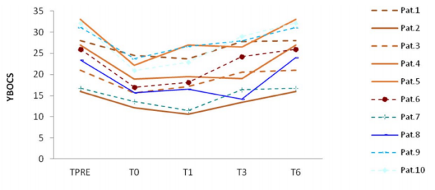 在這項研究中使用的主要測量系統(tǒng)是耶魯-布朗強迫癥量表(Y-BOCS),這是衡量強迫癥癥狀嚴重程度的金標準。結(jié)果發(fā)現(xiàn),所有患者的強迫癥癥狀直至T1,其中4例至T3改善。與其他參與者相比,這些患者表現(xiàn)出更廣泛的額區(qū)相位同步和額頂相干的重塑。