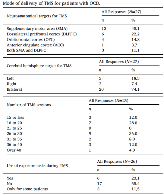 精神病學研究中心于2021年發(fā)表了一項針對強迫癥患者不同經(jīng)顱磁刺激方案的國際調(diào)查,旨在評估目前TMS治療強迫癥患者的常用方案和治療趨勢。數(shù)據(jù)收集在2020年4月至6月期間進行,使用自研的包含10個項目的在線問卷,調(diào)查了國際上的強迫癥患者的TMS治療診所。總共分析了來自10個國家的27份有效答復。TMS最常見的目標是補充運動區(qū),刺激通常給予雙側(cè),但不同中心的技術(shù)不同。暴露任務在TMS中并不常用。調(diào)查結(jié)論顯示目前還需要進行更多的研究,明確經(jīng)顱磁刺激治療強迫癥的最佳模式。[4]