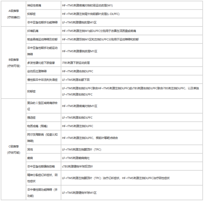除了正在進(jìn)行的臨床試驗(yàn),美國食品和藥物管理局(FDA)對(duì)經(jīng)顱磁刺激治療相關(guān)適應(yīng)癥的批準(zhǔn)也為臨床應(yīng)用奠定了基礎(chǔ)。這里我們回顧了FDA對(duì)經(jīng)顱磁刺激治療批準(zhǔn)的相關(guān)適應(yīng)癥以及國際臨床神經(jīng)生理學(xué)聯(lián)盟(IFCN)rTMS臨床治療指南中的推薦適應(yīng)癥。