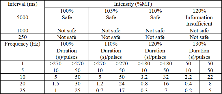 ???- Refer to the TMS safety guidelines established by the International Society of Transcranial Stimulation in 2009. When the intensity and frequency are fixed, the maximum duration for rTMS should not exceed the range listed in the lower part of the table, and the minimum interval should not be shorter than the range listed in the upper part of the table.